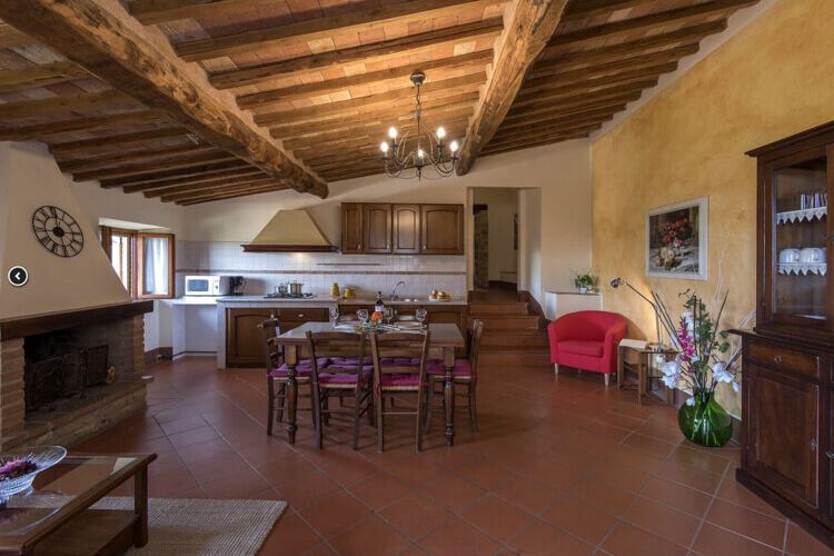 Im Inneren ist die geräumige Wohnung stilvoll und typisch für die Toskana in ländlicher Art eingerichtet. Es finden sich einige schöne Holz-Möbel und dennoch bleibt die Wirkung frisch und farbenfroh, nicht zuletzt wegen der teilweise colorierten Wände. Der Wohnraum ist sehr großzügig bemessen und bestens ausgestattet.